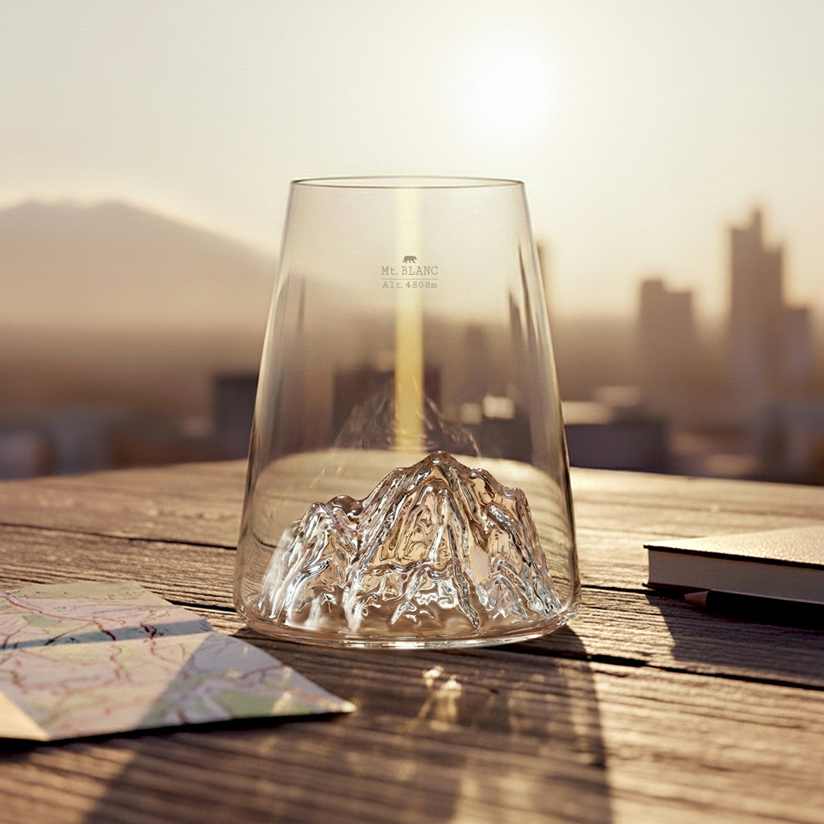 Ett exklusivt glas med skulpterad bergsform i botten.